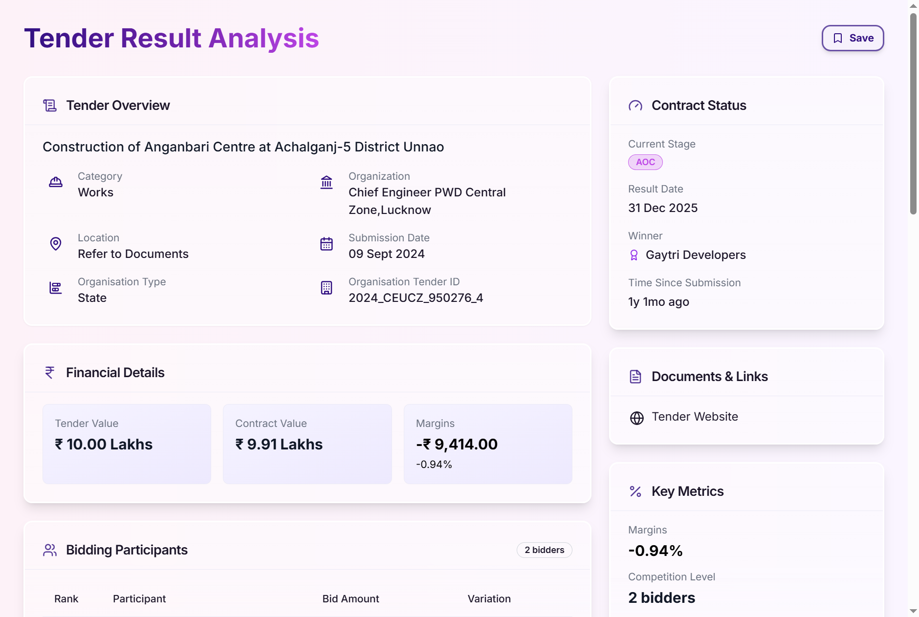 * Explore our **database of past tenders** to see who participated, who won, and the typical margins achieved.
