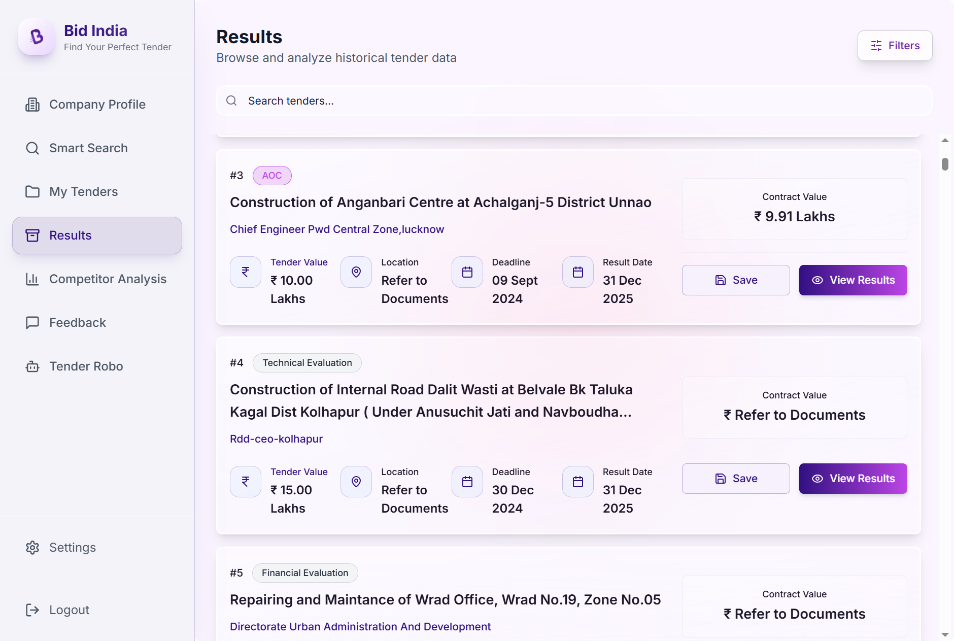 Understanding outcomes is just as important as finding opportunities. With **Bid India’s Results**, you get **instant insights from past tenders** turning historical data into a powerful guide for your next win.