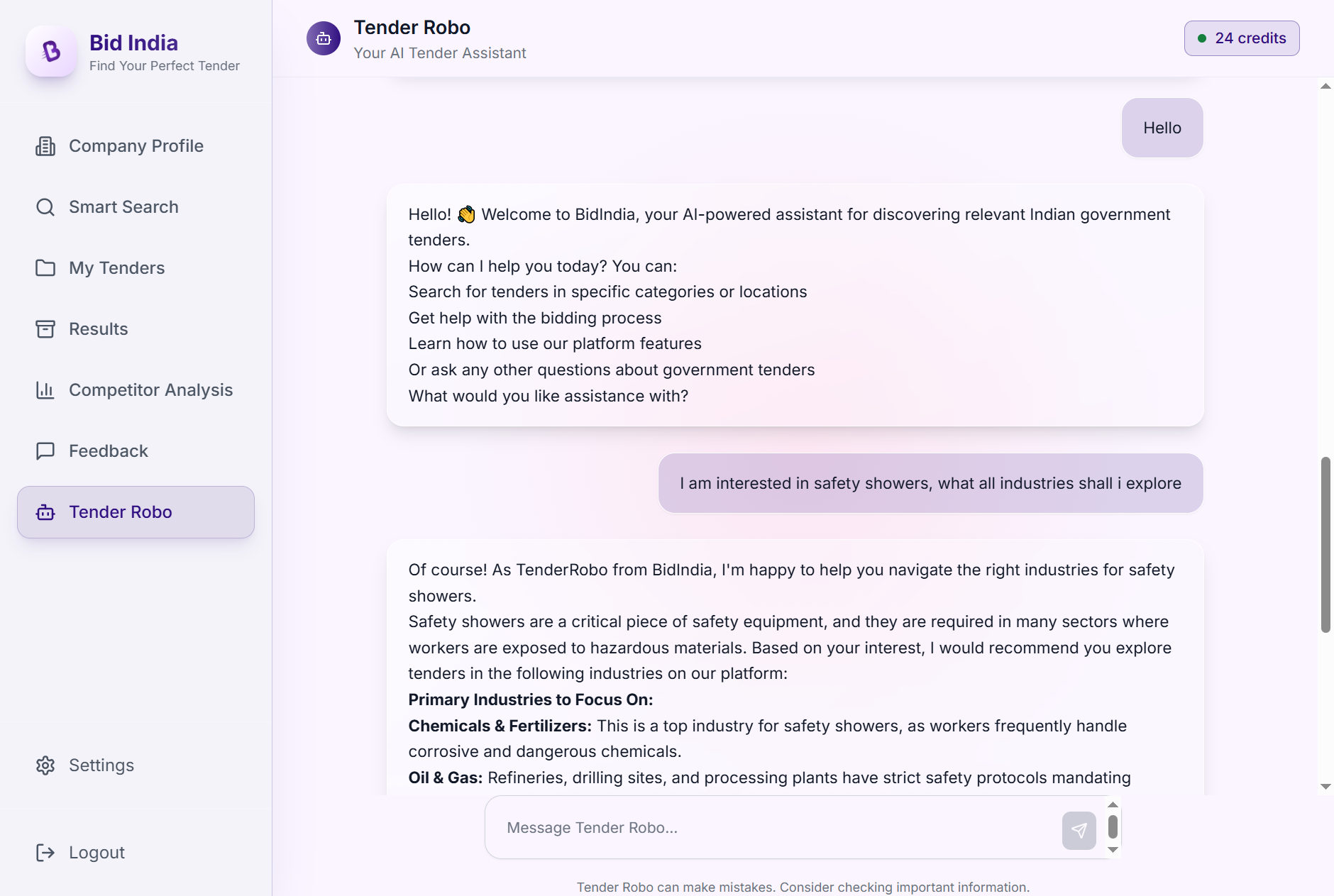 Meet your personal AI assistant for government tenders. **Tender Robo** is designed to make every step of the tender process intuitive, informative, and efficient.